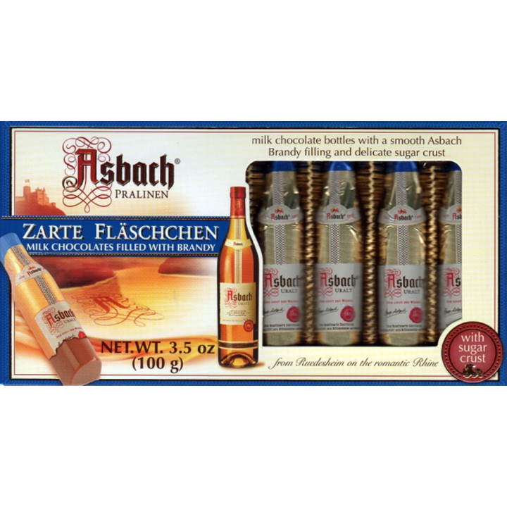 Milk Chocolate Zarte Fläschchens are filled with Asbach Brandy – protected in a very tender sugar crust and enrobed with milk chocolate. The smallest and most delicious way to enjoy the original Asbach Brandy.