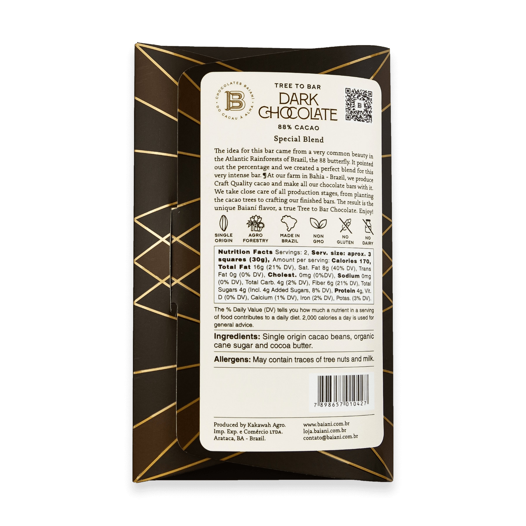 The inspiration for this recipe and percentage came from the Butterfly 88 (Diaethria Clymena), which inhabits our region and origin of cocoa, the Potumuju Valley. This bar has already received an honorable mention in awards outside of Brazil.