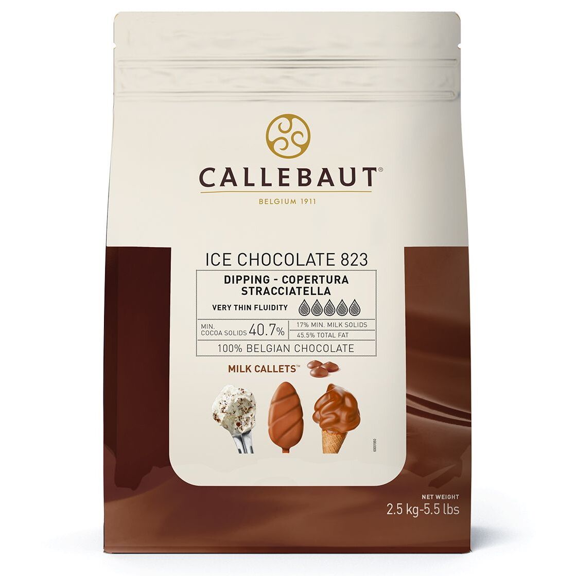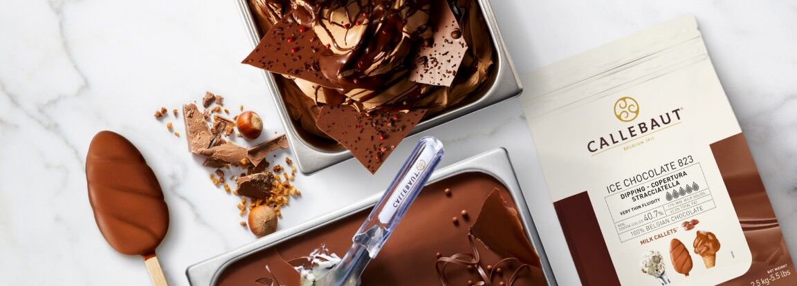 Ice Chocolate 823 is based on the original 823 recipe of Octaaf Callebaut and has been finetuned for gelato makers. With its high fluidity, this Ice Chocolate is ideal for dipping ice cream sticks and for making stracciatella. It has a rich cocoa and sweet caramel notes that make it unique. Thanks to its its high cocoa butter content, Ice Chocolate 823 yields perfect end results when used for dipping and stracciatella. It requires no tempering: simply melt it and you’re ready to go. The chocolate will harden within seconds in or around ice cream and enrobe it with a deliciously snappy layer. It furthermore melts quickly in the mouth to spoil with its rich cocoa and caramelly taste.