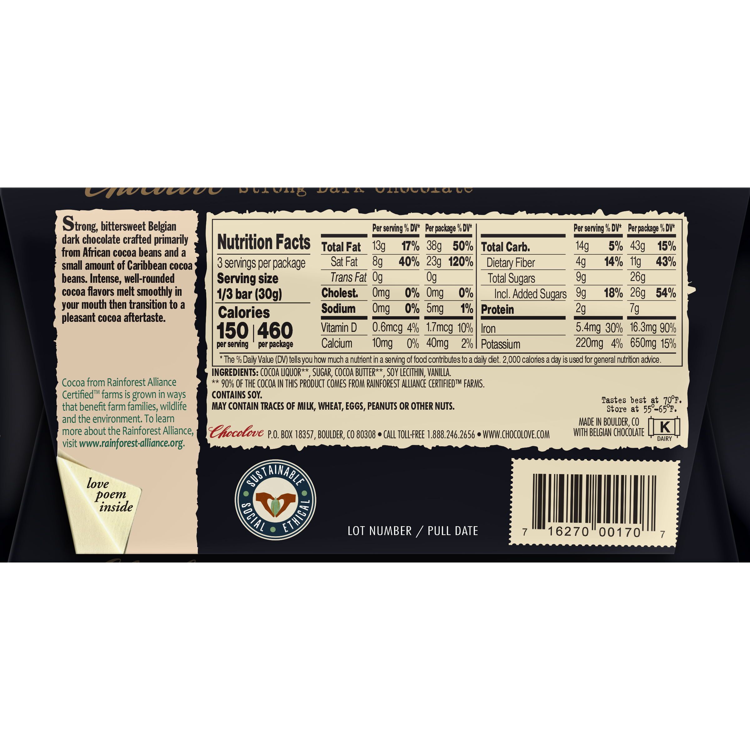 This is a very strong chocolate with 70% cocoa content. The rich blend of African cocoa beans has a small amount of Caribbean cocoa beans added to create a full-bodied chocolate. It’s carefully roasted for complete development of cocoa-flavor notes. Extra cocoa butter is added to balance to the strong cocoa flavor and provide a smooth mouth feel. Just enough sugar is used to soften the bitter notes. A long conching time produces an exceptionally fine particle size and a balanced flavor. Upon eating, the cocoa butter quickly gives way to a strong cocoa flavor. The intense and rounded cocoa flavor carries through in a long lasting, but smooth, aftertaste. This is a strong cocoa flavor from start to finish.