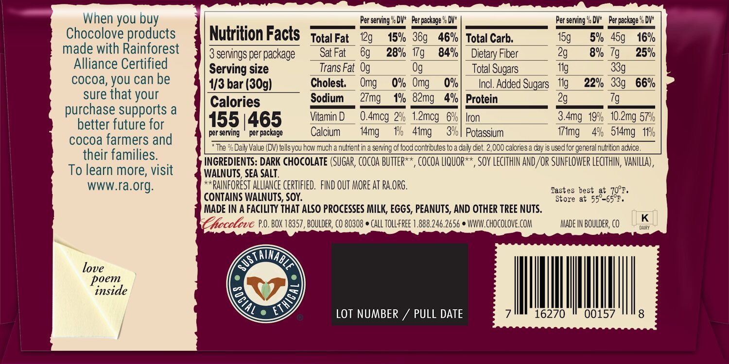 Each square melts smoothly, revealing roasted walnut pieces that add texture and depth. Crafted with simple, wholesome ingredients, this bar delivers a truly decadent and satisfying flavor experience.