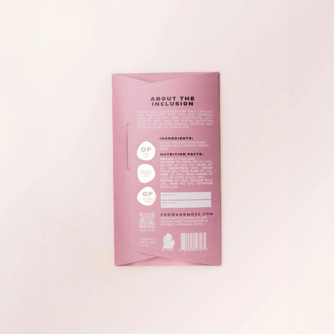 | Ingredients | Cacao, organic cane sugar, passion fruit, organic sesame seeds. |