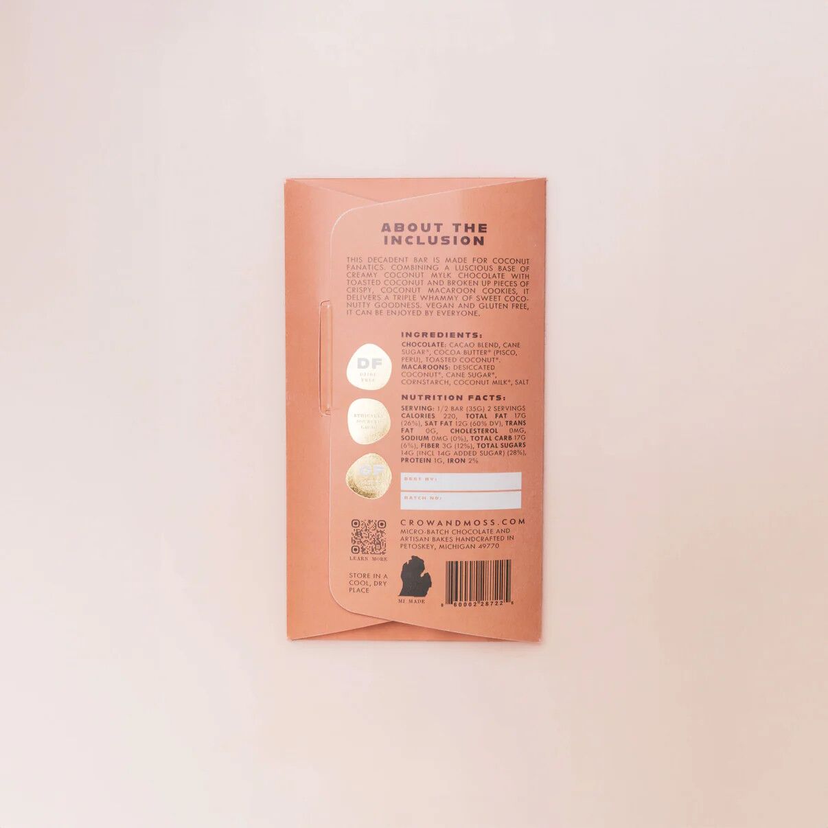 This decadent bar is made for coconut fanatics. Combining a luscious base of creamy coconut mylk chocolate with toasted coconut and broken up pieces of crispy, coconut macaroon cookies, it delivers a triple whammy of sweet coconutty goodness. Vegan and gluten free, it can be enjoyed by everyone.