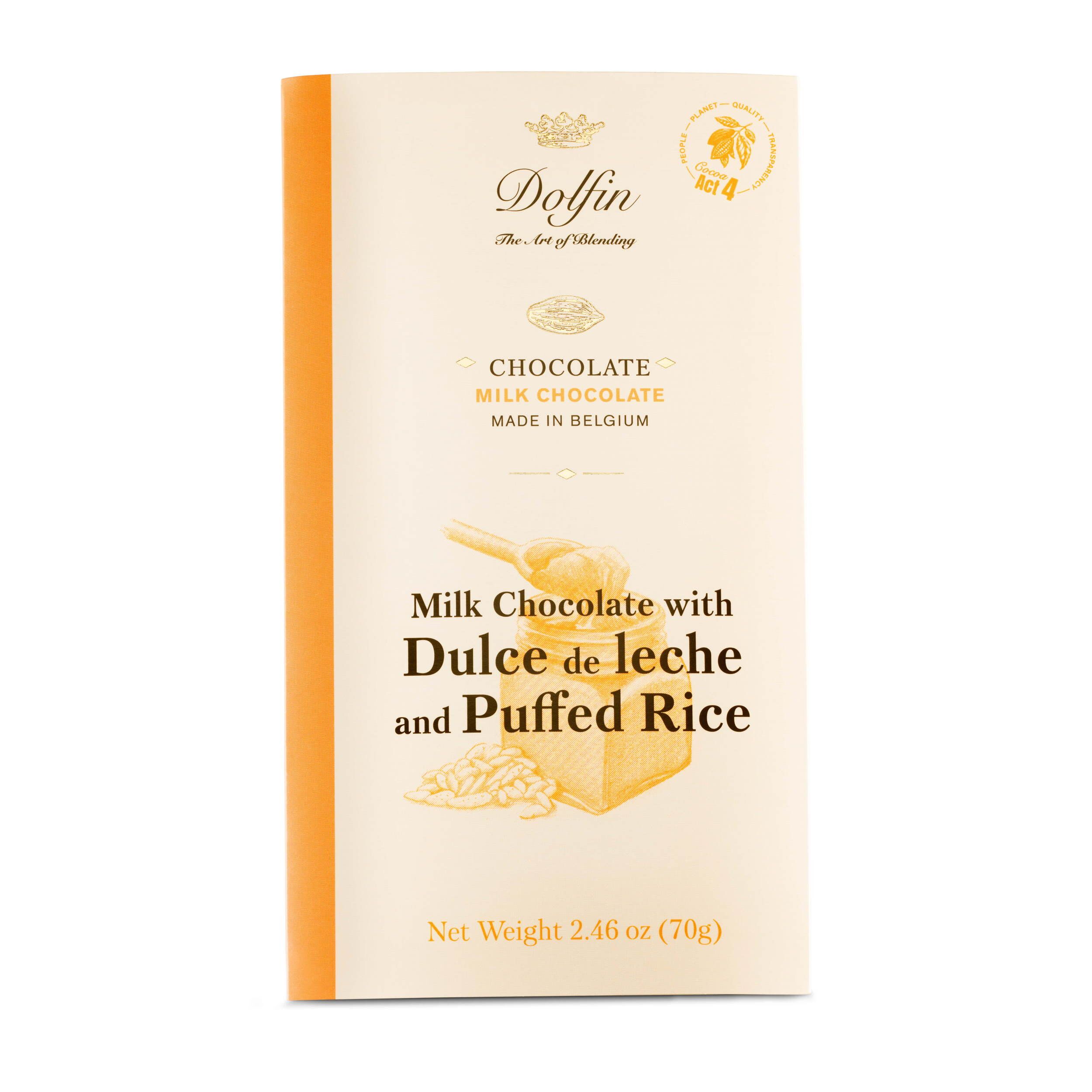 The dulce de leche or ‘caramelised milk’, a delicious blend of milk and sugar cooked very slowly, lends an added touch of sweetness to the milk chocolate, while the crunchy puffed rice brings a lively note to the mix.