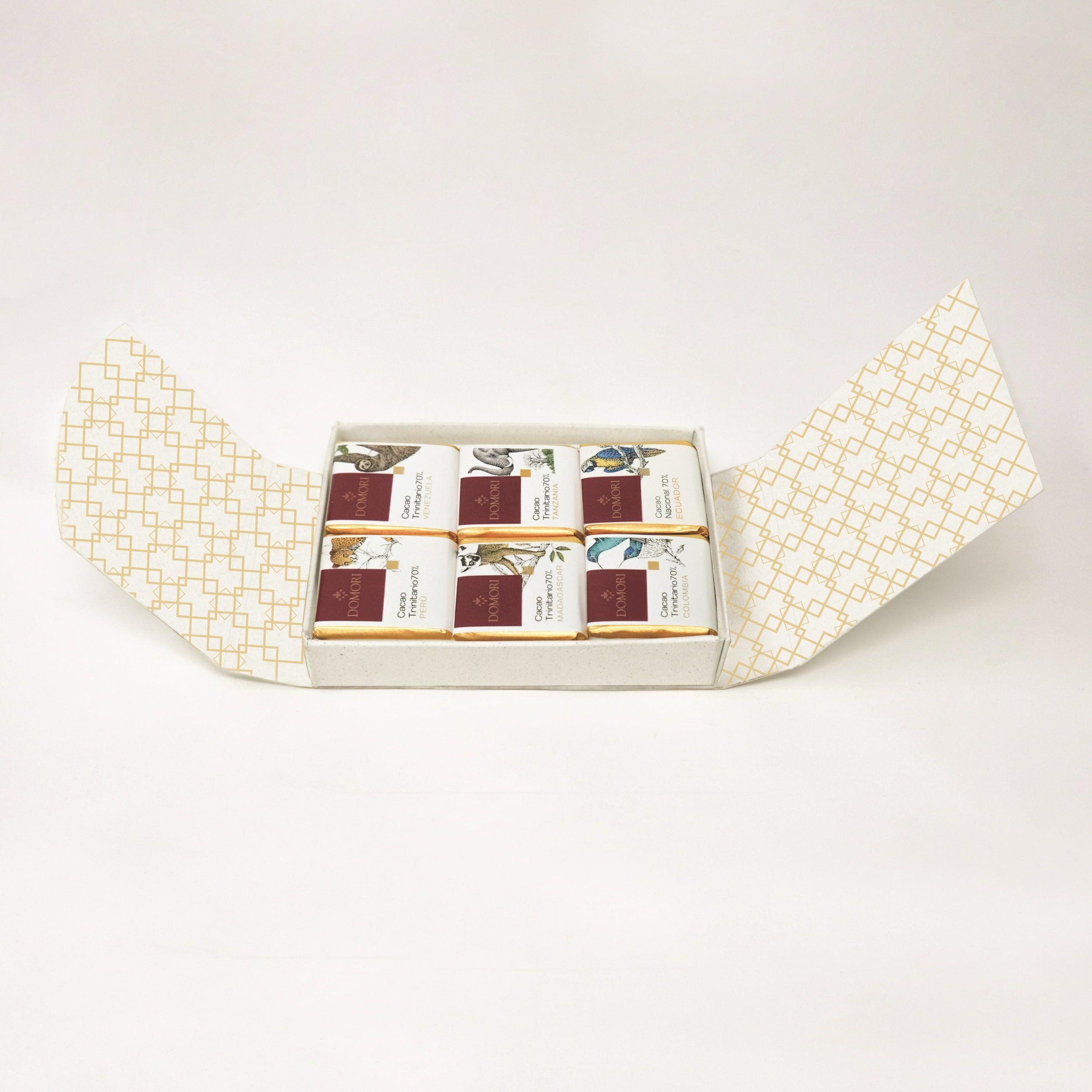 This Domori tasting kit containing 12 assorted Single Origins napolitains in an elegant and essential box. This selection includes 2x Venezuela, Tanzania, Peru, Colombia, Madagascar & Ecuador chocolate squares; perfect for gifting.