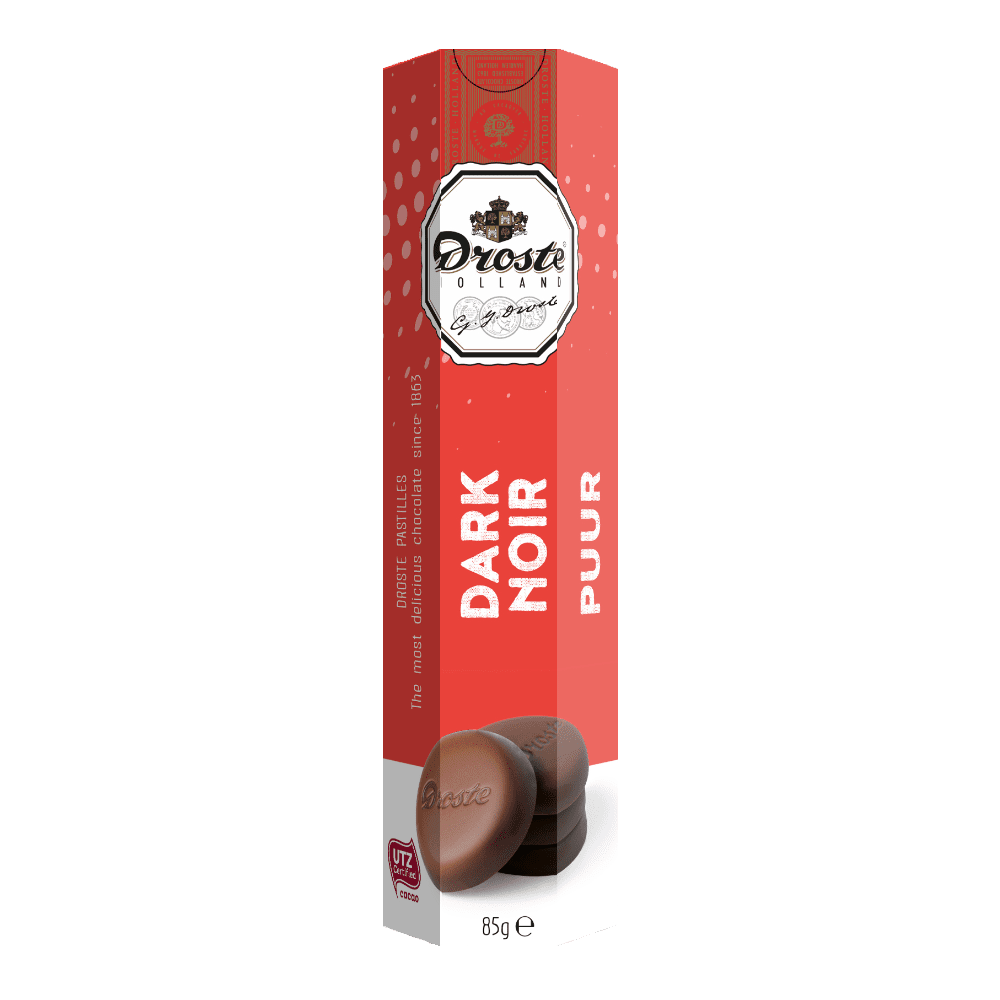 Delicious dark chocolate in an 85 gram tube, these are the Droste pure pastilles. Conched at very low temperatures so that the original flavor components are retained. Extra tasty dark chocolate!