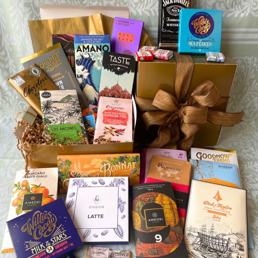 World Wide Chocolate’s Premium Gift Box, containing twenty chocolate bars as well as loose chocolates. The products in the image above are not necessarily what you will be receiving; this is an assorted mix of chocolate from our vast catalog, and you can choose your preference – whether it be dark, milk, white, or all three! You will receive a hand-wrapped gift box with twenty assorted chocolate bars.