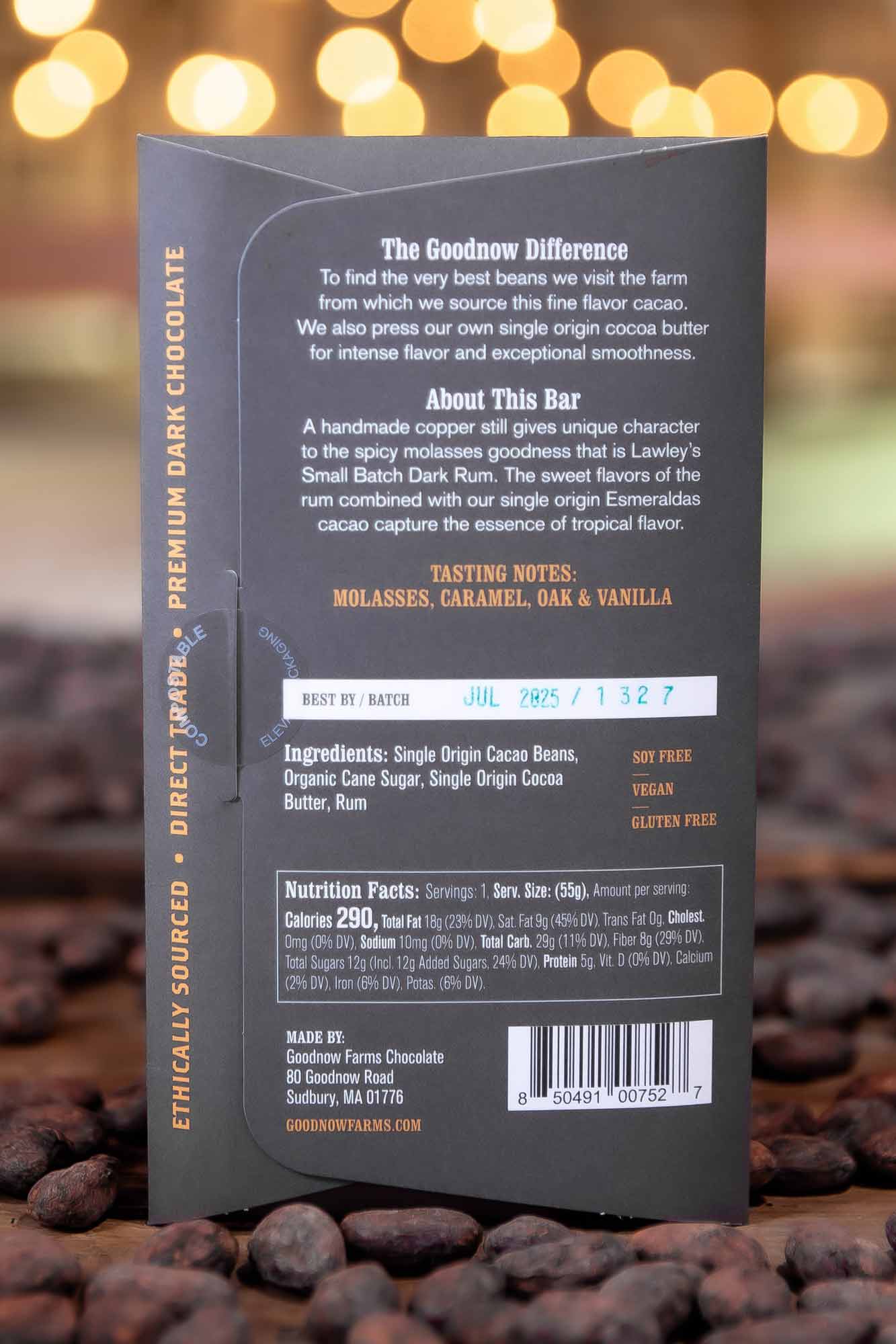 Goodnow roasts and winnows the same fine flavor Ecuador nibs used in the multiple award-winning Esmeraldas bar, then soak them in over 50 bottles of Lawley’s Rum. This allows the complex flavors to thoroughly infuse the nibs before they are carefully dried and put in stone grinders. The addition of fresh pressed, single origin Esmeraldas cocoa butter ensures this chocolate is intensely flavorful and exceptionally smooth.