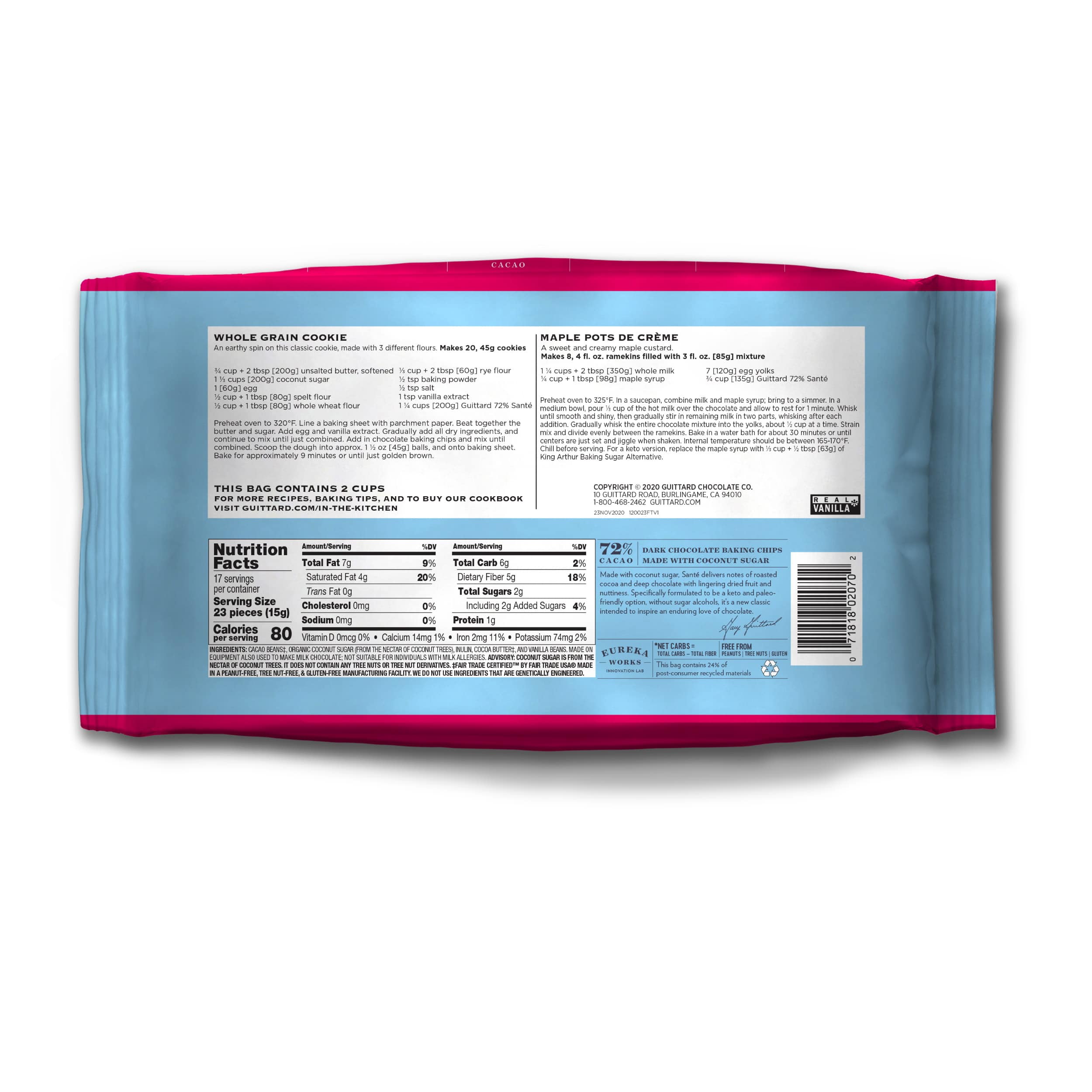 Notes of roasted cocoa and deep chocolate lead to lingering dried fruit and nuttiness with endnotes of subtle coconut and lingering vanilla. No sugar alcohols, no refined sugar. Same blend as the bulk Santé wafers, but different labeling.