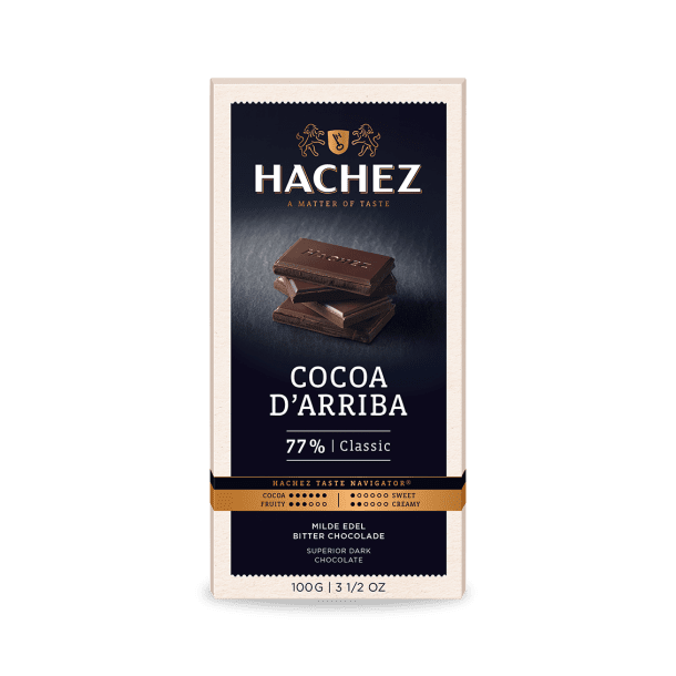 Experience the all-natural intensity of a Hachez Classic 77% Cocoa D’Arriba Dark Chocolate Bar. Enjoy a deep silky richness that melts in your mouth, offering a lingering mildness that makes this all-natural bar one to revel in again and again.