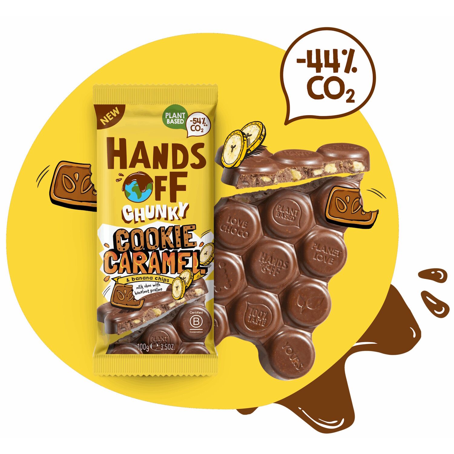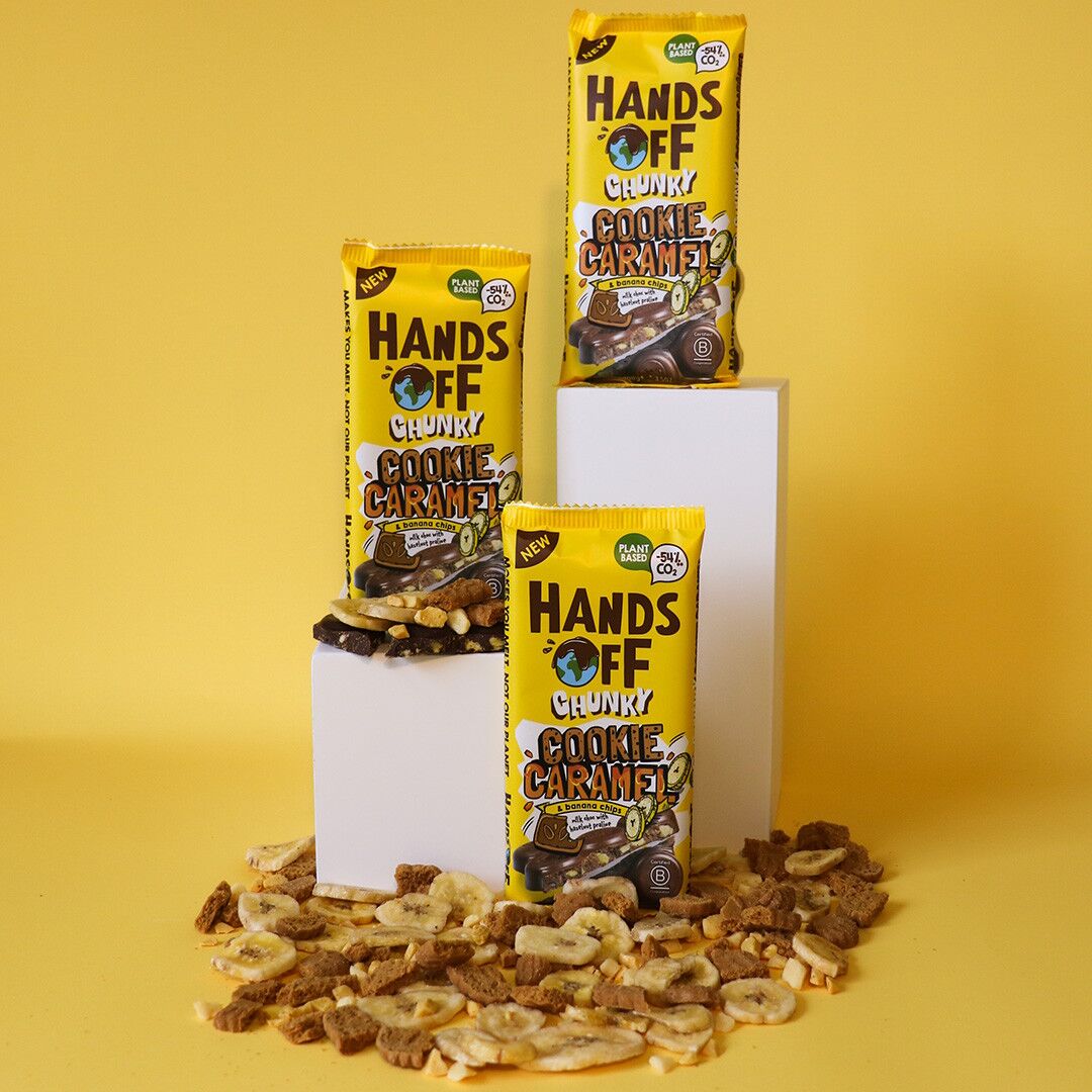 Choco, cookie, caramel & banana—this is the ultimate chunky mix. Creamy m!lk chocolate with hazelnut praline, caramel chunks, crunchy cookie pieces and banana chips (yes, really!) for that extra bite.