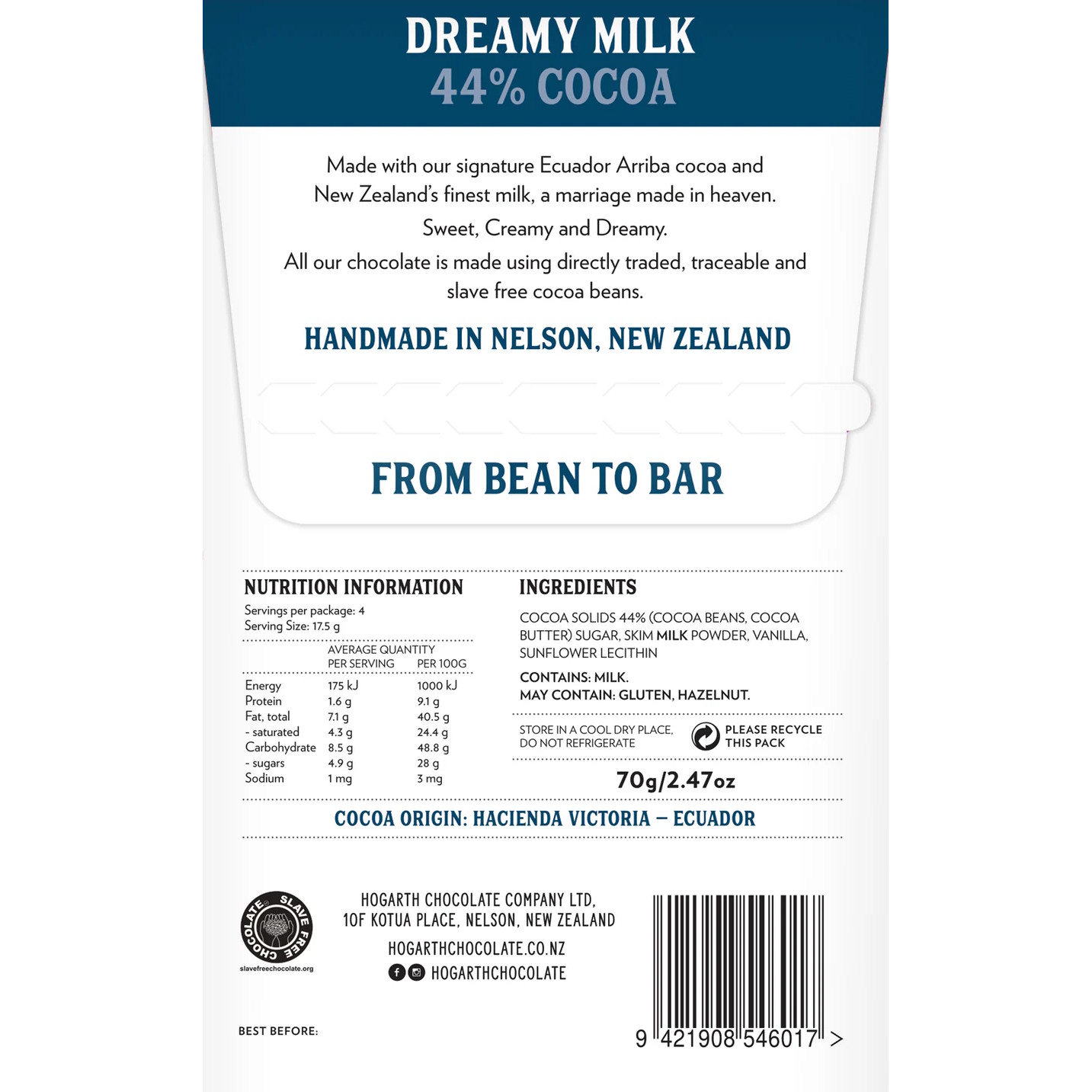 Dreamy Milk 44% milk chocolate. Made with Hogarth’s signature Ecuador Arriba cocoa and New Zealand’s finest milk, a marriage made in heaven.