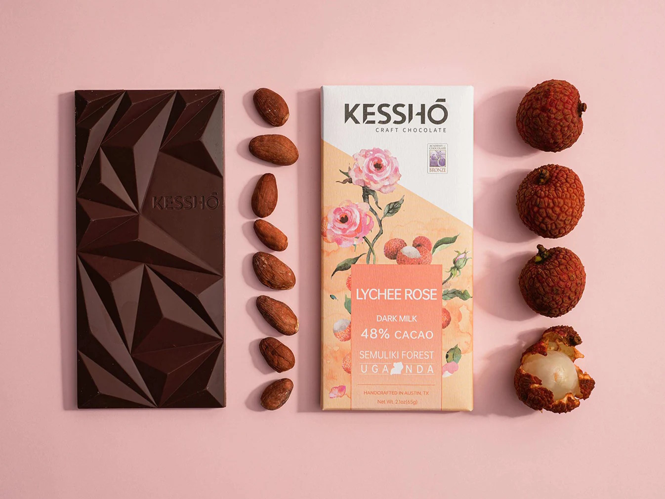 A burst of floral lychee sweetness melts into creamy dark chocolate. Dried lychee pieces intertwine with the velvety texture to create a blissful creamy cacao experience accented by gentle notes of rose petals. Each bite blooms with lychee and rose flavors that mingle with rich chocolate for an indulgent sensory experience.