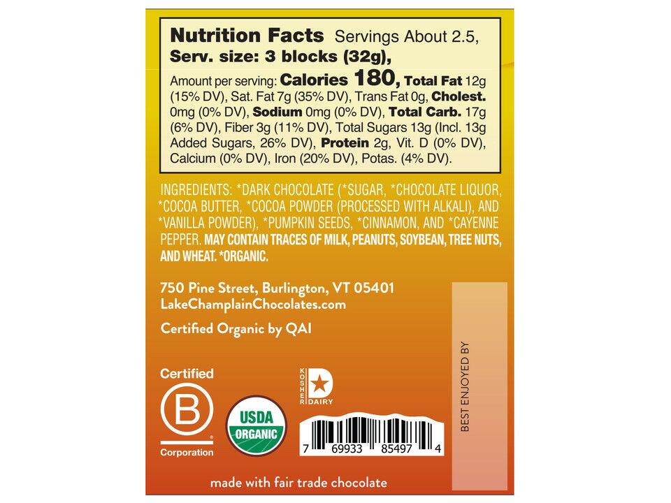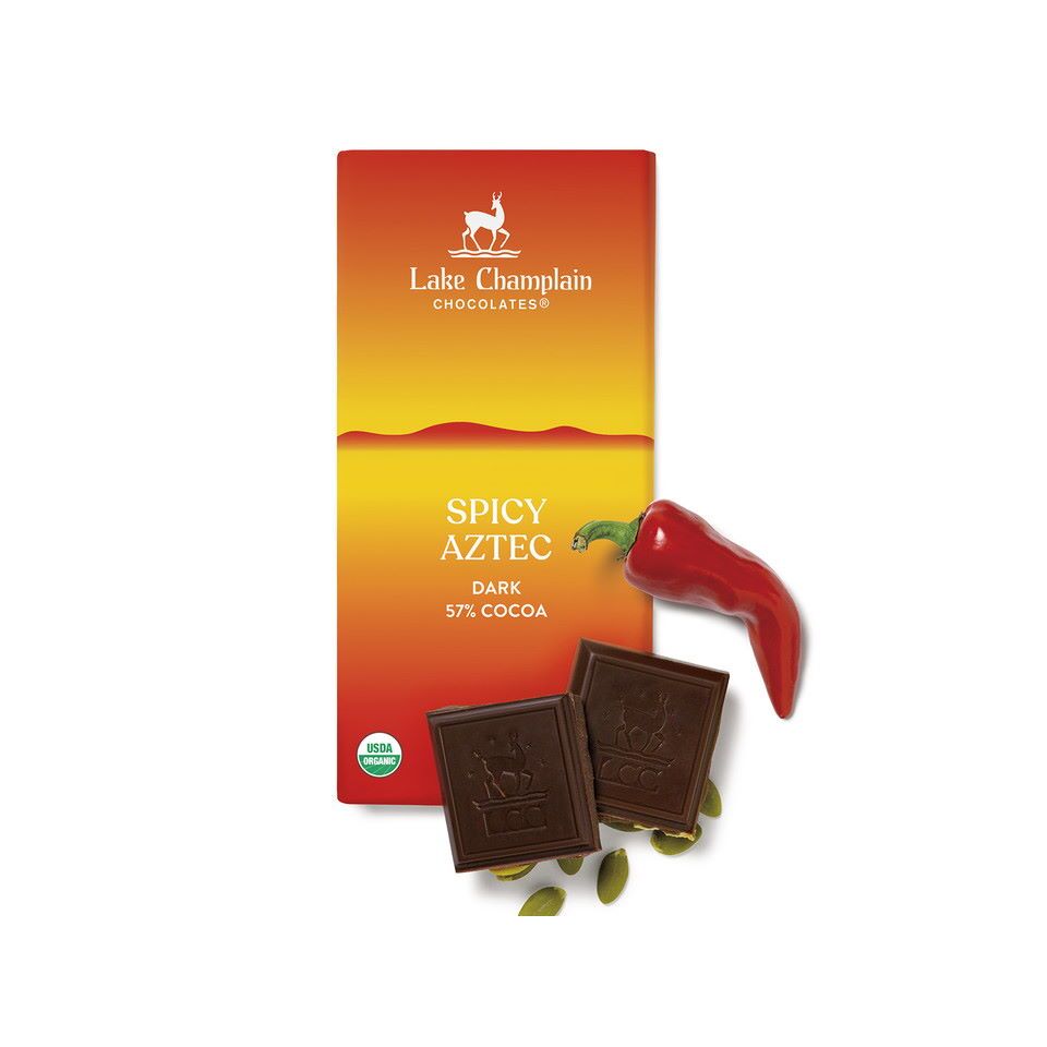 Turn up the heat on your “something sweet” – and discover a taste for spicy dark chocolate. Explore the exciting flavors of ancient Mexico in this spicy-sweet organic chocolate bar. Blended from semisweet dark chocolate, crunchy pumpkin seeds, hot cayenne pepper, and fragrant cinnamon . . . an adventure for the palate in every sweet and spicy bite!