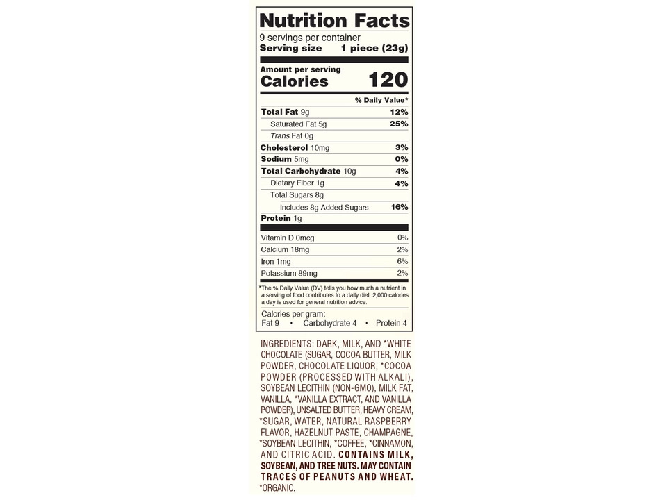 This box includes one of each of the following: 72% Dark Truffle, All Milk Truffle, Cappuccino Truffle, Champagne Truffle, French Roast Truffle, Hazelnut Truffle, Legendary Dark Truffle, Raspberry Truffle, White Raspberry Truffle.