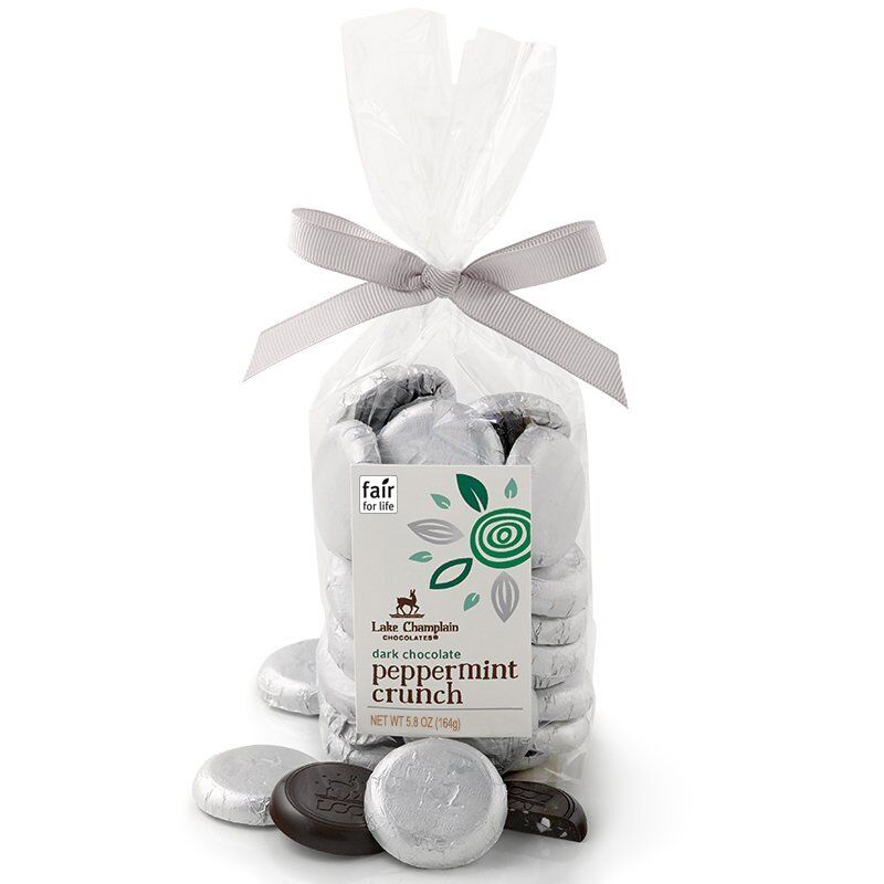 Lake Champlain Chocolates has taken organic and fair trade certified 57% cocoa content dark chocolate coins and infused them with a refreshing peppermint crunch, Individually wrapped in silver foil, these make the perfect snack-sized treat! Beautifully packaged in cello and ribbon and ready for gifting.