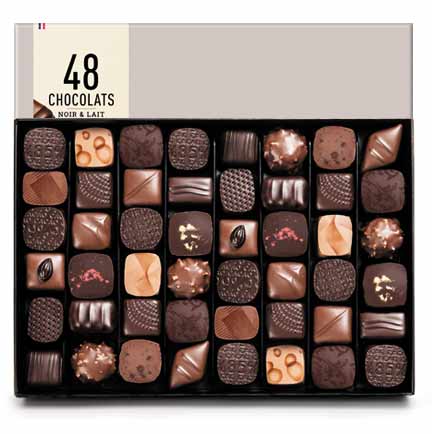 48 assorted gourmet milk & dark chocolate truffles, ganache, caramel, praliné (almonds and hazelnut), and Single Estate Plantation chocolate. All decorations and colorings are 100% natural.