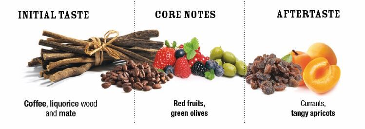 Tasting notes: liquorice stick and raw cocoa, tangy notes, hints of green olive, aftermelt of raisins and dried apricots.