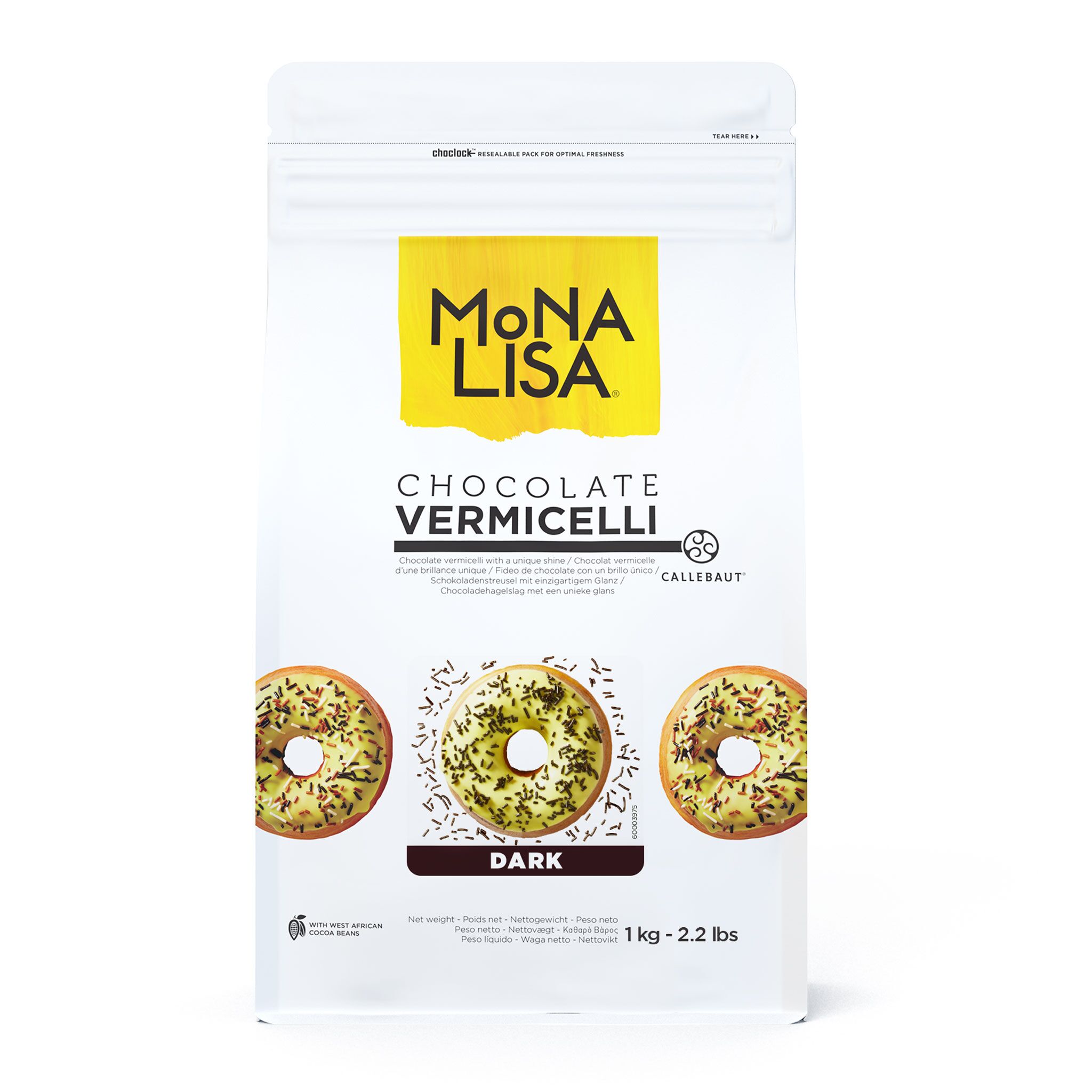 Mona Lisa by Callebaut dark chocolate vermicelli is made with natural vanilla. These chocolate sprinkles are great for decorations, pastry, confectionery, ice-creams. Note: Contains dairy products. Length: 5mm.