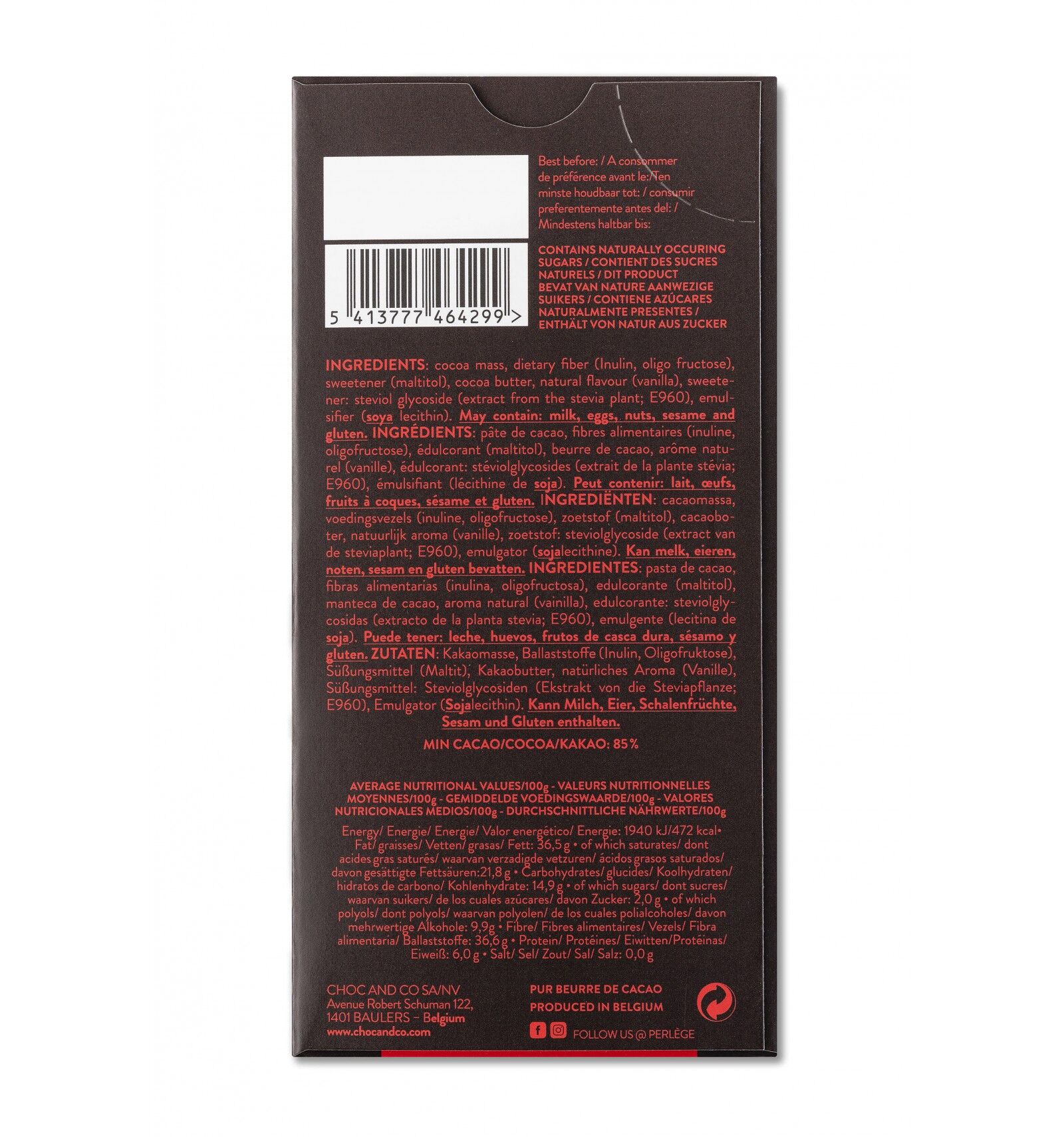 Ingredients | Cocoa mass, dietary fiber (inulin, oligo fructose), sweetener (maltitol), cocoa butter, emulsifier (soy lecithin), natural flavor (vanilla), sweetener: steviol glycosides from Stevia May contain: milk, eggs, nuts & gluten |