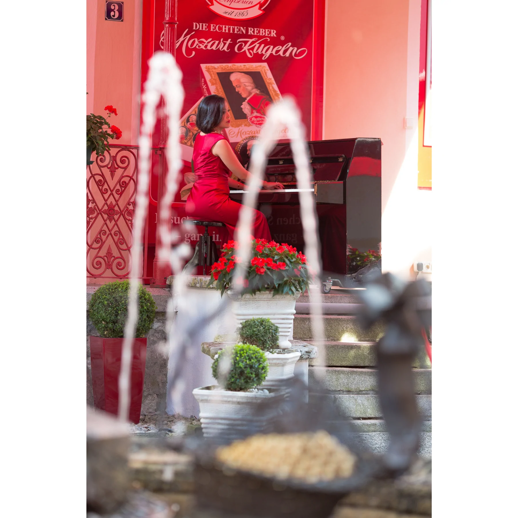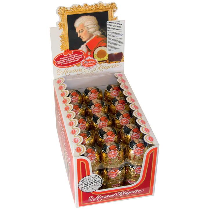 Reber display contains 45 Genuine Reber Mozart-Kugeln, each one exquisitely filled with the finest gourmet pistachio marzipan made from fresh, green pistachios, almonds, hazelnut nougat, and covered with a layer of milk and dark chocolate.