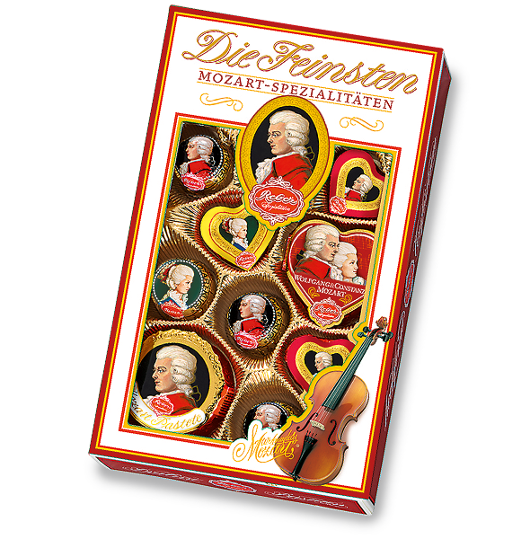 Reber Mozart Specialties Assortment in Gift Box contains a 12 piece assortment of classic Mozart Kugeln and Mozart Hearts with pistachio nougat covered in dark chocolate, Constanze Kugeln and Constanze Heart with pistachio nougat covered in milk chocolate, Mozart Pastete (honey cream truffle with pistachio nougat covered in dark chocolate), and a Mozart & Constanze Heart (cream truffle with brandy sultanas covered in milk chocolate).