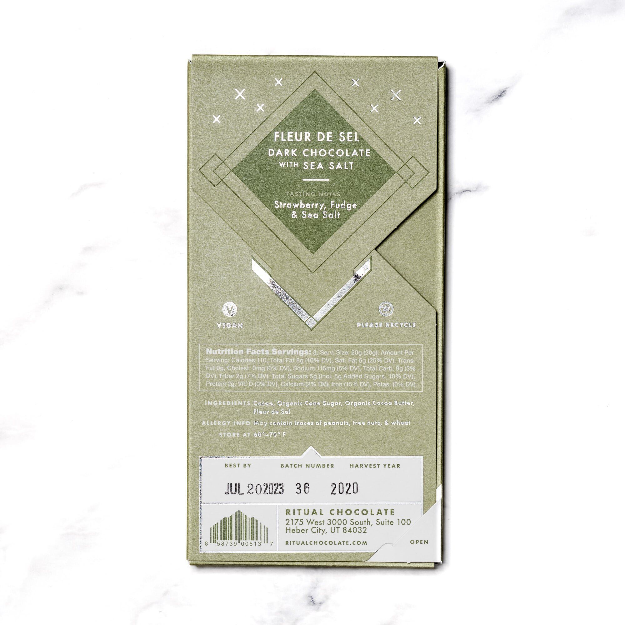 | Ingredients | Cacao, organic cane sugar, organic cocoa butter, fleur de sel. May contain traces of peanuts, tree nuts & wheat. |