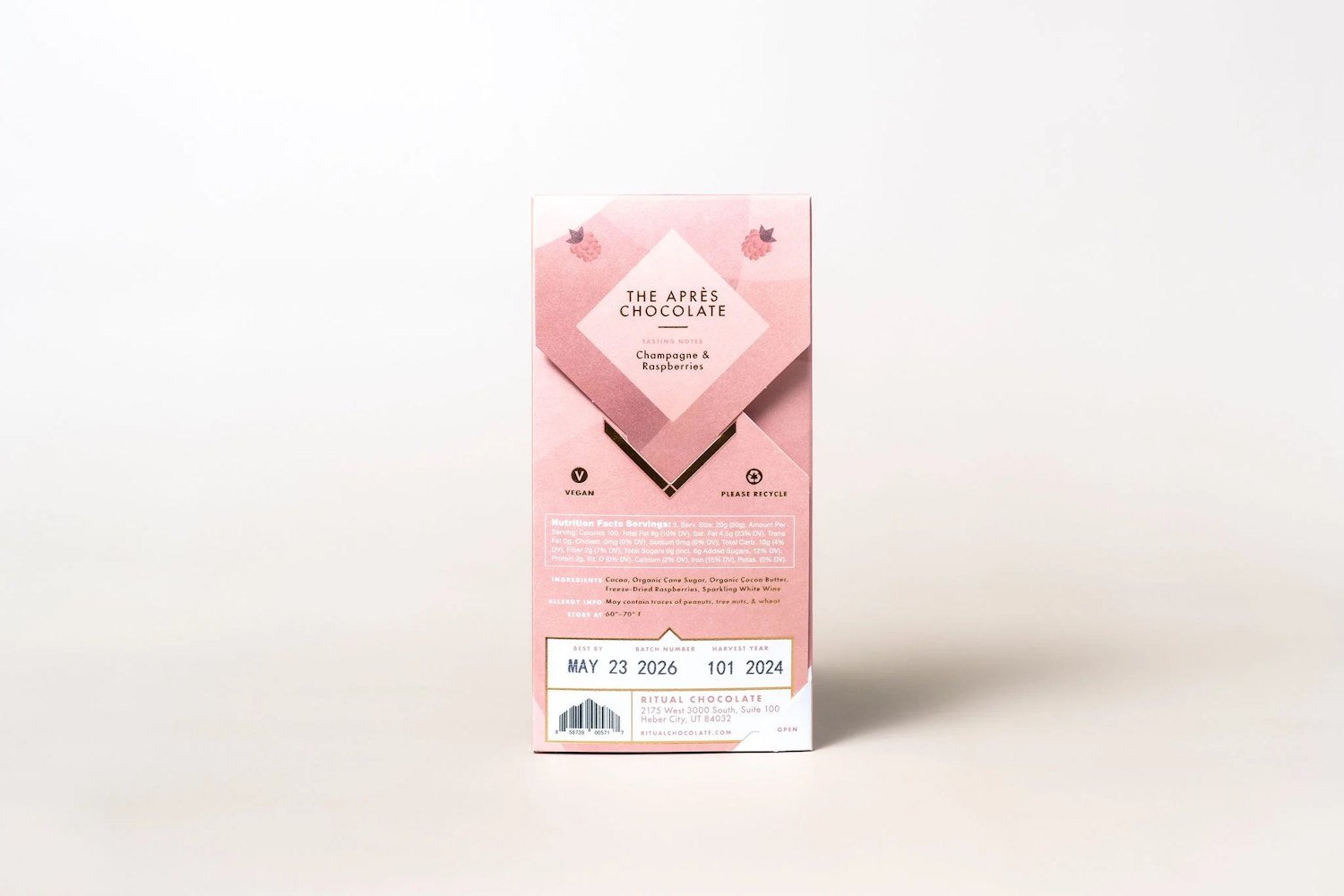 Ritual is excited to announce the addition of our Après Bar to their Utah Mountain Line! This raspberry–topped bar was such a hit as our Limited Edition Berries and Bubbly Bar that we decided to add it permanently to our Mountain Line as the Après Bar.