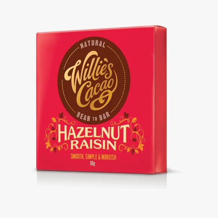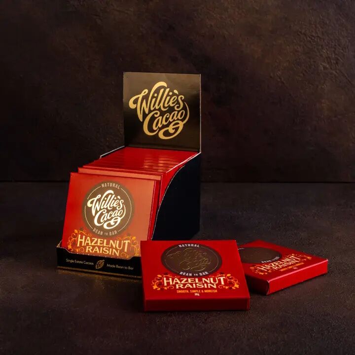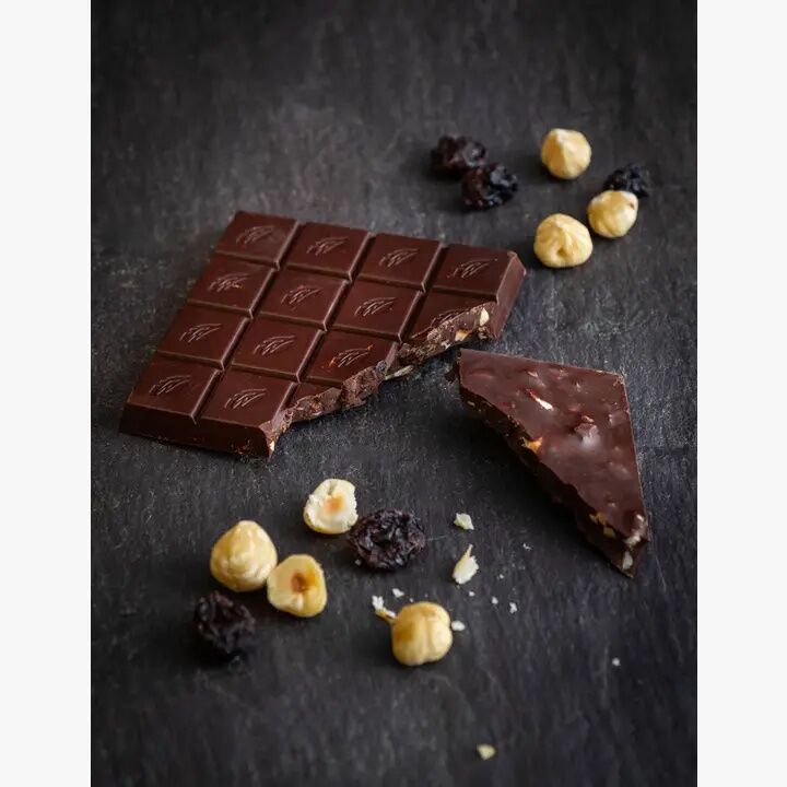 This is one moreish square of chocolate. Here you have a rich dark chocolate with notes of raisins and plums, studded with juicy raisins and freshly roasted hazelnuts with their soft round flavor.