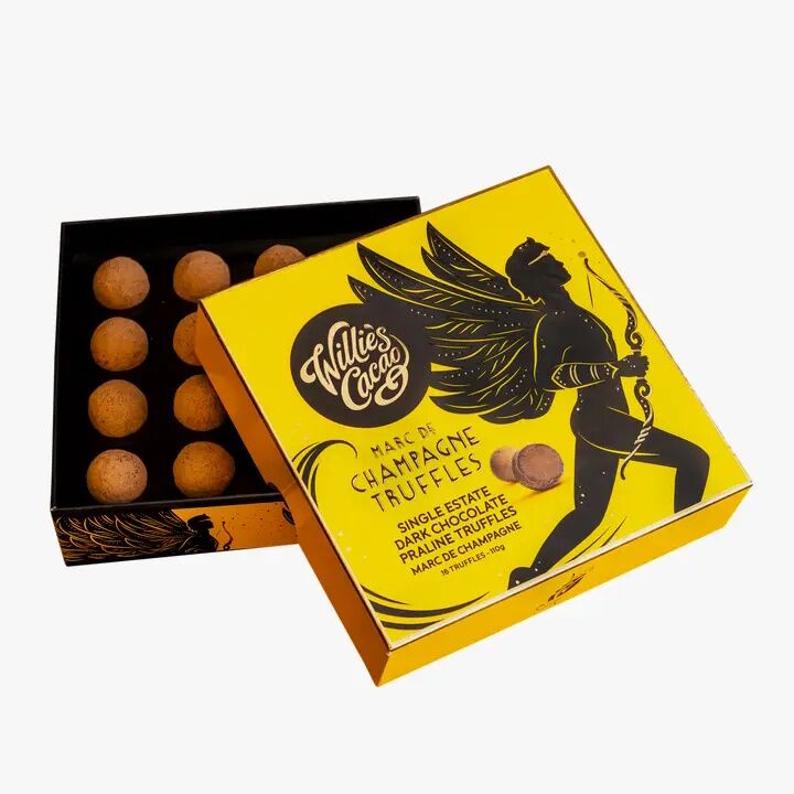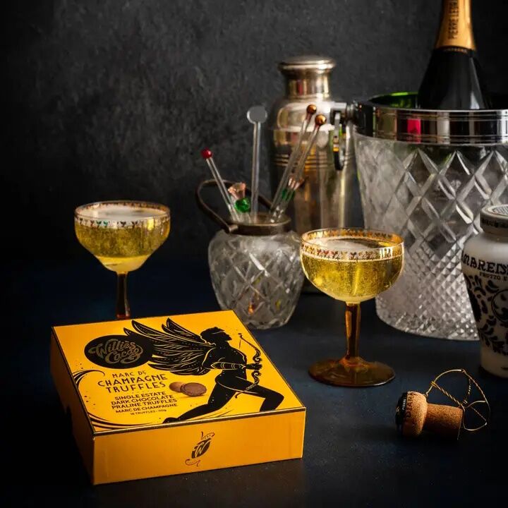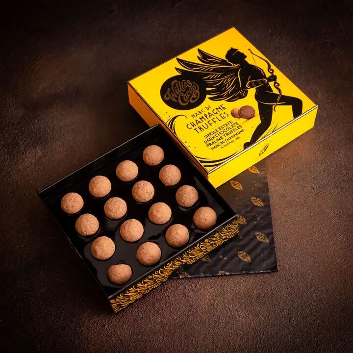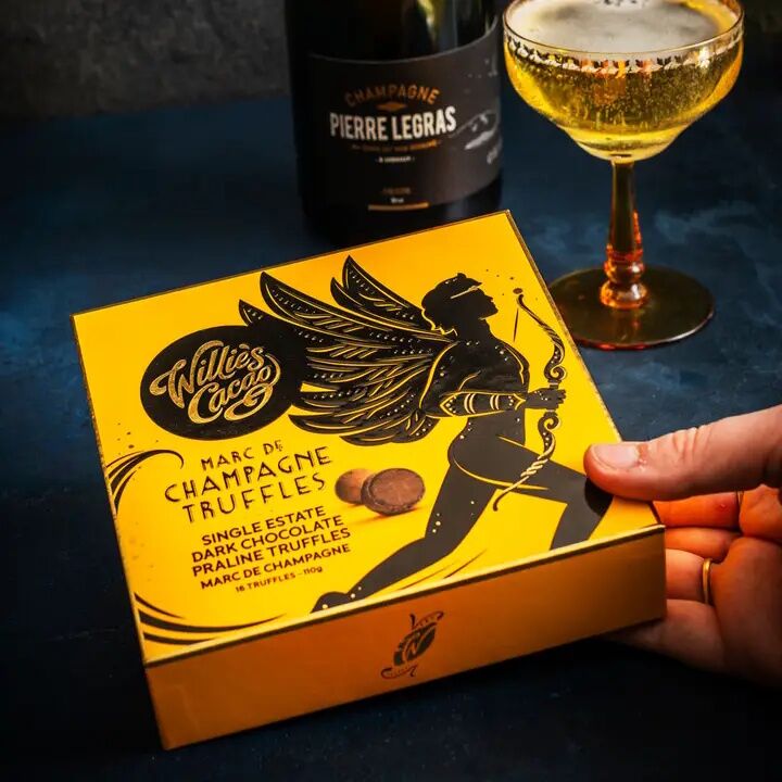Rich, nutty, single estate dark chocolate gently entwines with smooth Marc de Champagne and freshly roasted hazelnuts.