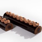 Glaze the Buche and place the frozen whipped ganache decoration on top of the Buche.